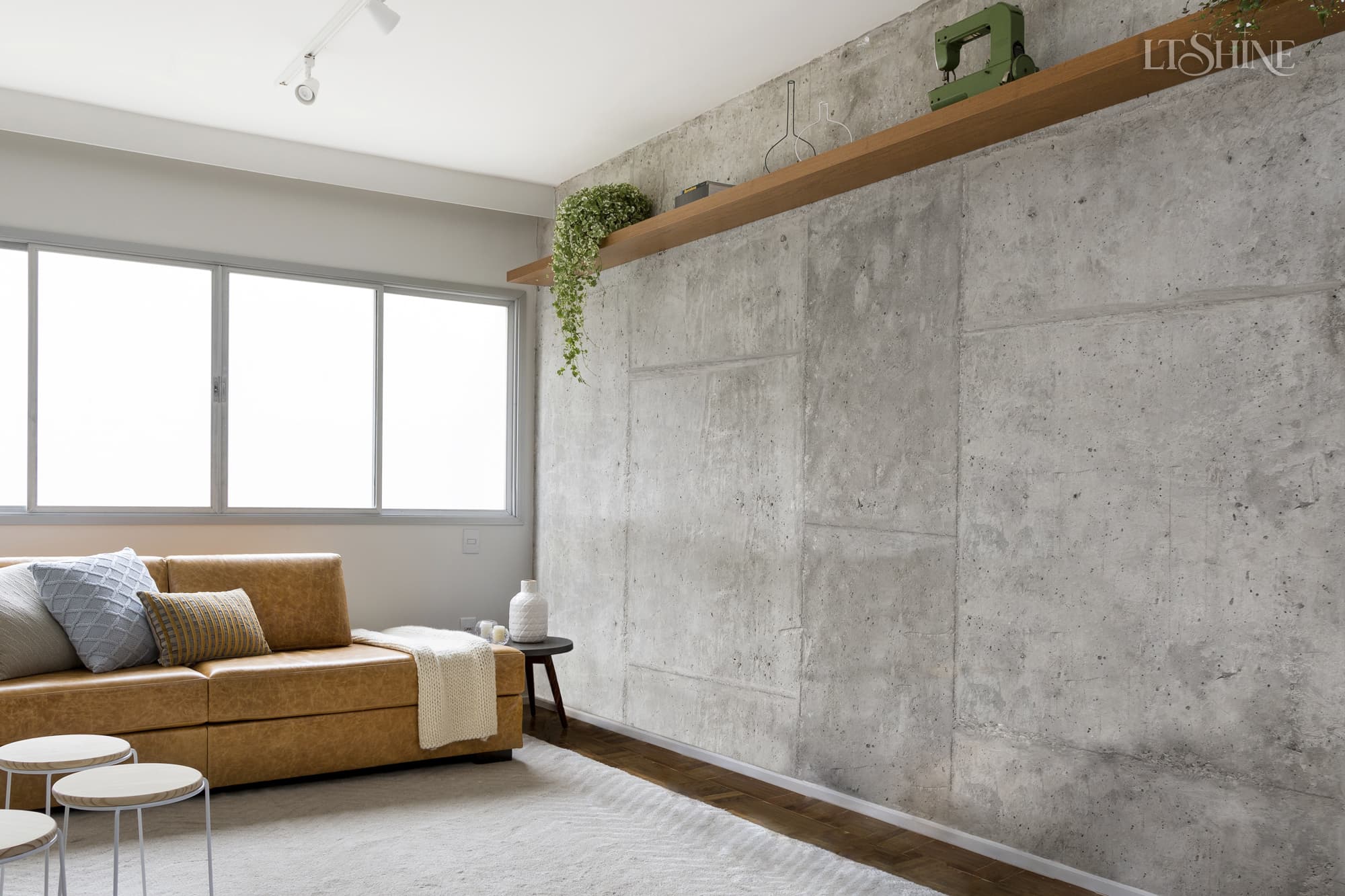 o Primer Universal LT Shine para melhor aderência, regularizar com a Massa Preparadora LT Shine e aplicar o revestimento Concreto Aparente LT Shine, seguindo e